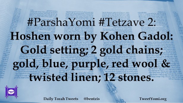#ParshaYomi #Tetzave 2: Hoshen worn by Kohen Gadol: Gold setting; 2 gold chains; gold, blue, purple, red wool & twisted linen; 12 stones.