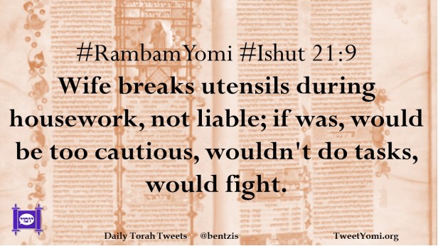 #RambamYomi #Ishut 21:9 Wife breaks utensils during housework, not liable; if was, would be too cautious, wouldn’t do tasks, would fight.