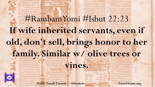 #RambamYomi #Ishut 22:23 If wife inherited servants, even if old, don’t sell, brings honor to her family. Similar w/ olive trees or vines.
