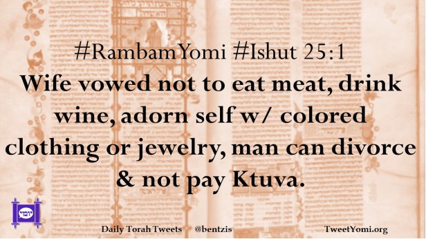 #RambamYomi #Ishut 25:1 Wife vowed not to eat meat, drink wine, adorn self w/ colored clothing or jewelry, man can divorce & not pay Ktuva.