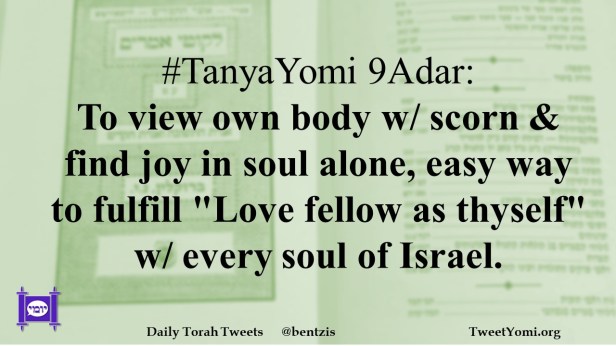 #TanyaYomi 9Adar: To view own body w/ scorn & find joy in soul alone, easy way to fulfill “Love fellow as thyself” w/ every soul of Israel.