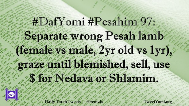 DafYomi, Pesahim #DafYomi #Pesahim 97 Date: April 29, 2021Author: ysspitz #DafYomi #Pesahim 97: Separate wrong Pesah lamb (female vs male, 2yr old vs 1yr), graze until blemished, sell, use $ for Nedava or Shlamim. Share this: Share on X (Opens in new window) X Share on Facebook (Opens in new window) Facebook Like Loading... Related