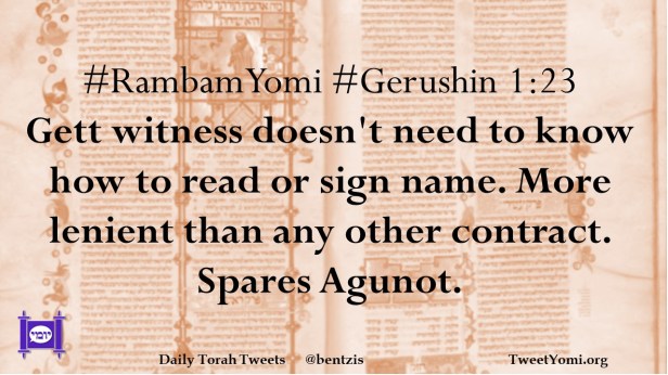 #RambamYomi #Gerushin 1:23 Gett witness doesn’t need to know how to read or sign name. More lenient than any other contract. Spares Agunot.