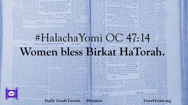 HalachaYomi #HalachaYomi OC 47:14 Date: May 3, 2021Author: ysspitz #HalachaYomi OC 47:14 Women bless Birkat HaTorah. Share this: Share on X (Opens in new window) X Share on Facebook (Opens in new window) Facebook Like Loading... Related
