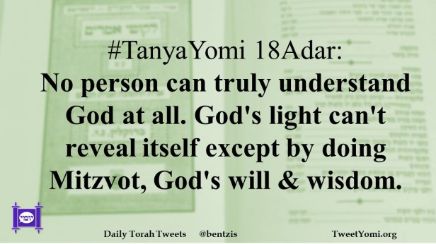 #TanyaYomi 18Adar: No person can truly understand God at all. God’s light can’t reveal itself except by doing Mitzvot, God’s will & wisdom.