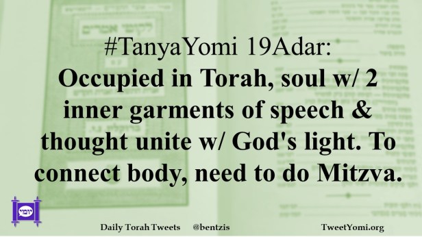#TanyaYomi 19Adar: Occupied in Torah, soul w/ 2 inner garments of speech & thought unite w/ God’s light. To connect body, need to do Mitzva.