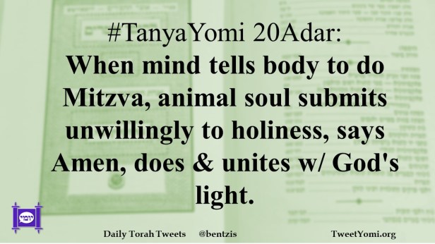 #TanyaYomi 20Adar: When mind tells body to do Mitzva, animal soul submits unwillingly to holiness, says Amen, does & unites w/ God’s light.