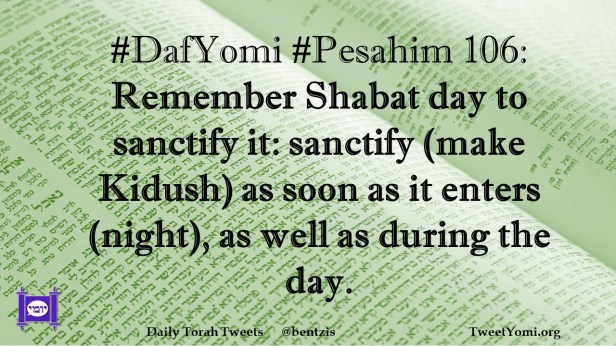 DafYomi, Pesahim #DafYomi #Pesahim 106 Date: July 1, 2021Author: ysspitz #DafYomi #Pesahim 106: Remember Shabat day to sanctify it: sanctify (make Kidush) as soon as it enters (night), as well as during the day. Share this: Share on X (Opens in new window) X Share on Facebook (Opens in new window) Facebook Like Loading... Related