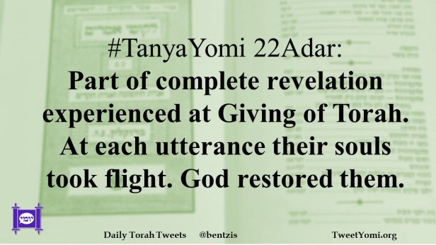 #TanyaYomi 22Adar: Part of complete revelation experienced at Giving of Torah. At each utterance their souls took flight. God restored them.