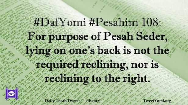 DafYomi, Pesahim #DafYomi #Pesahim 108 Date: July 4, 2021Author: ysspitz #DafYomi #Pesahim 108: For purpose of Pesah Seder, lying on one’s back is not the required reclining, nor is reclining to the right. Share this: Share on X (Opens in new window) X Share on Facebook (Opens in new window) Facebook Like Loading... Related
