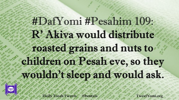 DafYomi, Pesahim #DafYomi #Pesahim 109 Date: July 4, 2021Author: ysspitz #DafYomi #Pesahim 109: R’ Akiva would distribute roasted grains and nuts to children on Pesah eve, so they wouldn’t sleep and would ask. Share this: Share on X (Opens in new window) X Share on Facebook (Opens in new window) Facebook Like Loading... Related