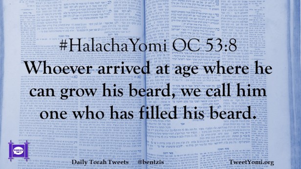 HalachaYomi #HalachaYomi OC 53:8 Date: July 4, 2021Author: ysspitz #HalachaYomi OC 53:8 Whoever arrived at age where he can grow his beard, we call him one who has filled his beard. Share this: Share on X (Opens in new window) X Share on Facebook (Opens in new window) Facebook Like Loading... Related
