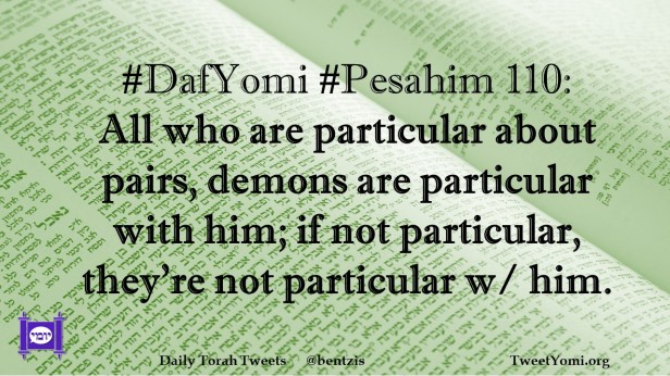 DafYomi, Pesahim #DafYomi #Pesahim 110 Date: July 5, 2021Author: ysspitz #DafYomi #Pesahim 110: All who are particular about pairs, demons are particular with him; if not particular, they’re not particular w/ him. Share this: Share on X (Opens in new window) X Share on Facebook (Opens in new window) Facebook Like Loading... Related