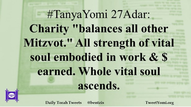 #TanyaYomi 27Adar: Charity “balances all other Mitzvot.” All strength of vital soul embodied in work & $ earned. Whole vital soul ascends.