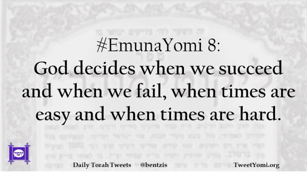 EmunaYomi #EmunaYomi 8 Date: July 6, 2021Author: ysspitz #EmunaYomi 8: God decides when we succeed and when we fail, when times are easy and when times are hard. Share this: Share on X (Opens in new window) X Share on Facebook (Opens in new window) Facebook Like Loading... Related