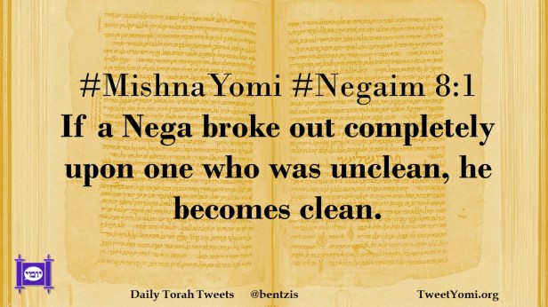 MishnaYomi, Negaim #MishnaYomi #Negaim 8:1 Date: July 6, 2021Author: ysspitz #MishnaYomi #Negaim 8:1 If a Nega broke out completely upon one who was unclean, he becomes clean. Share this: Share on X (Opens in new window) X Share on Facebook (Opens in new window) Facebook Like Loading... Related