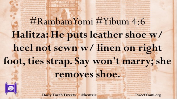 #RambamYomi #Yibum 4:6 Halitza: He puts leather shoe w/ heel not sewn w/ linen on right foot, ties strap. Say won’t marry; she removes shoe.