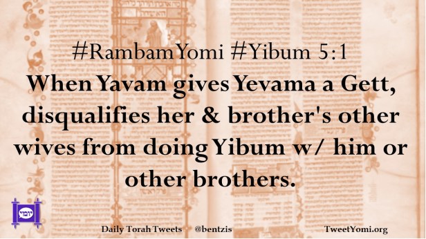 #RambamYomi #Yibum 5:1 When Yavam gives Yevama a Gett, disqualifies her & brother’s other wives from doing Yibum w/ him or other brothers.