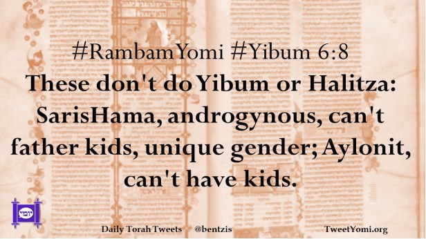 #RambamYomi #Yibum 6:8 These don’t do Yibum or Halitza: SarisHama, androgynous, can’t father kids, unique gender; Aylonit, can’t have kids.