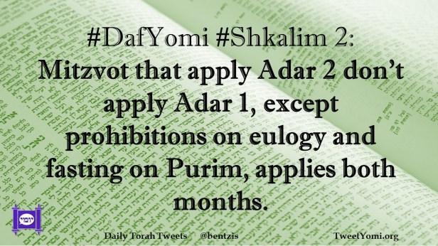 DafYomi, Shkalim #DafYomi #Shkalim 2 Date: July 9, 2021Author: ysspitz #DafYomi #Shkalim 2: Mitzvot that apply Adar 2 don’t apply Adar 1, except prohibitions on eulogy and fasting on Purim, applies both months. Share this: Share on X (Opens in new window) X Share on Facebook (Opens in new window) Facebook Like Loading... Related