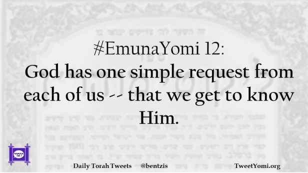 EmunaYomi #EmunaYomi 12 Date: July 9, 2021Author: ysspitz #EmunaYomi 12: God has one simple request from each of us — that we get to know Him. Share this: Share on X (Opens in new window) X Share on Facebook (Opens in new window) Facebook Like Loading... Related