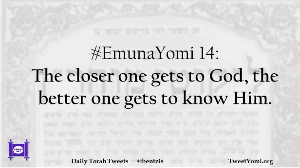 EmunaYomi #EmunaYomi 14 Date: July 9, 2021Author: ysspitz #EmunaYomi 14: The closer one gets to God, the better one gets to know Him. Share this: Share on X (Opens in new window) X Share on Facebook (Opens in new window) Facebook Like Loading... Related