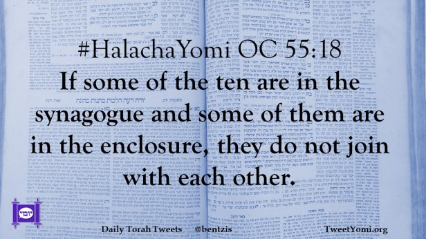 #HalachaYomi OC 55:18 If some of the ten are in the synagogue and some of them are in the enclosure, they do not join with each other.