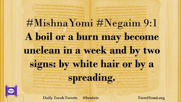 MishnaYomi, Negaim #MishnaYomi #Negaim 9:1 Date: July 9, 2021Author: ysspitz #MishnaYomi #Negaim 9:1 A boil or a burn may become unclean in a week and by two signs: by white hair or by a spreading. Share this: Share on X (Opens in new window) X Share on Facebook (Opens in new window) Facebook Like Loading... Related