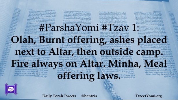 #ParshaYomi #Tzav 1: Olah, Burnt offering, ashes placed next to Altar, then outside camp. Fire always on Altar. Minha, Meal offering laws.