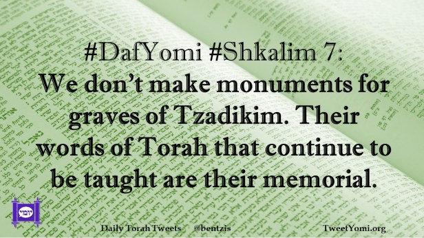 DafYomi, Shkalim #DafYomi #Shkalim 7 Date: July 11, 2021Author: ysspitz #DafYomi #Shkalim 7: We don’t make monuments for graves of Tzadikim. Their words of Torah that continue to be taught are their memorial. Share this: Share on X (Opens in new window) X Share on Facebook (Opens in new window) Facebook Like Loading... Related