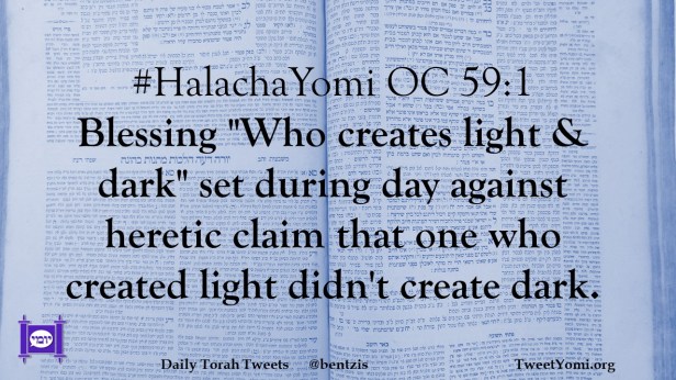#HalachaYomi OC 59:1 Blessing “Who creates light & dark” set during day against heretic claim that one who created light didn’t create dark.