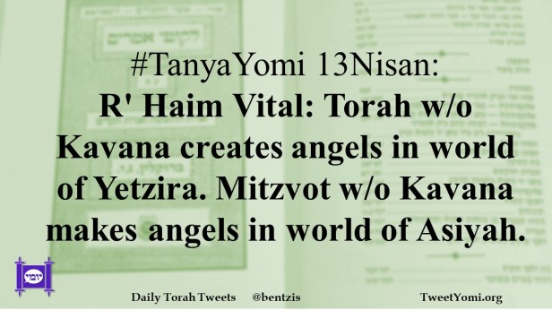 #TanyaYomi 13Nisan: R’ Haim Vital: Torah w/o Kavana creates angels in world of Yetzira. Mitzvot w/o Kavana makes angels in world of Asiyah.