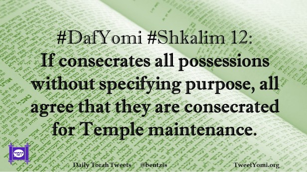 DafYomi, Shkalim #DafYomi #Shkalim 12 Date: July 12, 2021Author: ysspitz #DafYomi #Shkalim 12: If consecrates all possessions without specifying purpose, all agree that they are consecrated for Temple maintenance. Share this: Share on X (Opens in new window) X Share on Facebook (Opens in new window) Facebook Like Loading... Related