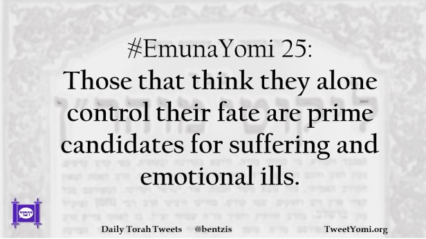 EmunaYomi #EmunaYomi 25 Date: July 12, 2021Author: ysspitz #EmunaYomi 25: Those that think they alone control their fate are prime candidates for suffering and emotional ills. Share this: Share on X (Opens in new window) X Share on Facebook (Opens in new window) Facebook Like Loading... Related