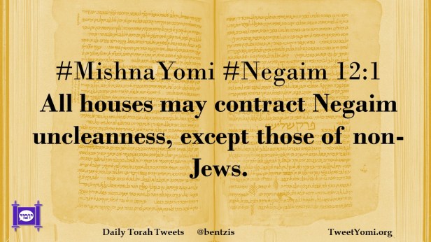 MishnaYomi, Negaim #MishnaYomi #Negaim 12:1 Date: July 12, 2021Author: ysspitz #MishnaYomi #Negaim 12:1 All houses may contract Negaim uncleanness, except those of non-Jews. Share this: Share on X (Opens in new window) X Share on Facebook (Opens in new window) Facebook Like Loading... Related
