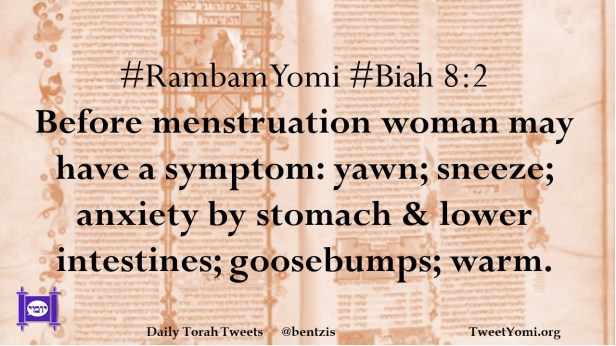 #RambamYomi #Biah 8:2 Before menstruation woman may have a symptom: yawn; sneeze; anxiety by stomach & lower intestines; goosebumps; warm.