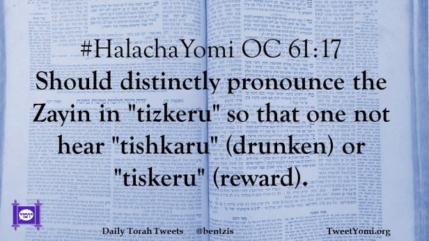 #HalachaYomi OC 61:17 Should distinctly pronounce the Zayin in “tizkeru” so that one not hear “tishkaru” (drunken) or “tiskeru” (reward).