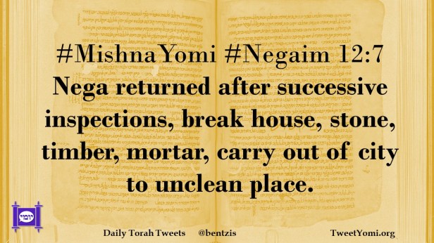 #MishnaYomi #Negaim 12:7 Nega returned after successive inspections, break house, stone, timber, mortar, carry out of city to unclean place.