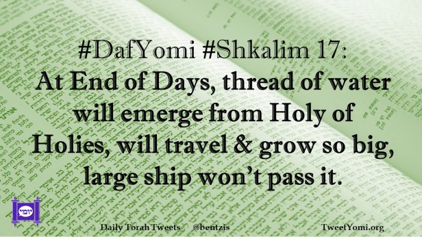 DafYomi, Shkalim #DafYomi #Shkalim 17 Date: July 14, 2021Author: ysspitz #DafYomi #Shkalim 17: At End of Days, thread of water will emerge from Holy of Holies, will travel & grow so big, large ship won’t pass it. Share this: Share on X (Opens in new window) X Share on Facebook (Opens in new window) Facebook Like Loading... Related