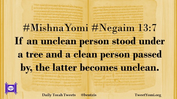 MishnaYomi, Negaim #MishnaYomi #Negaim 13:7 Date: July 14, 2021Author: ysspitz #MishnaYomi #Negaim 13:7 If an unclean person stood under a tree and a clean person passed by, the latter becomes unclean. Share this: Share on X (Opens in new window) X Share on Facebook (Opens in new window) Facebook Like Loading... Related