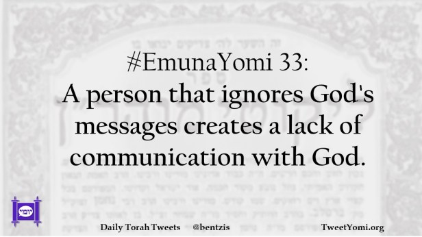 EmunaYomi #EmunaYomi 33 Date: July 15, 2021Author: ysspitz #EmunaYomi 33: A person that ignores God’s messages creates a lack of communication with God. Share this: Share on X (Opens in new window) X Share on Facebook (Opens in new window) Facebook Like Loading... Related