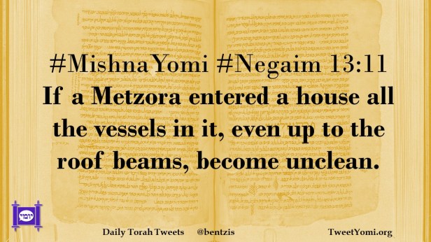MishnaYomi, Negaim #MishnaYomi #Negaim 13:11 Date: July 15, 2021Author: ysspitz #MishnaYomi #Negaim 13:11 If a Metzora entered a house all the vessels in it, even up to the roof beams, become unclean. Share this: Share on X (Opens in new window) X Share on Facebook (Opens in new window) Facebook Like Loading... Related
