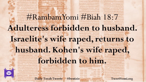 #RambamYomi #Biah 18:7 Adulteress forbidden to husband. Israelite’s wife raped, returns to husband. Kohen’s wife raped, forbidden to him.