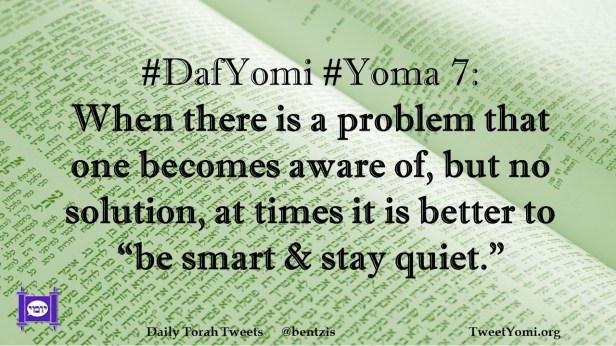 DafYomi, Yoma #DafYomi #Yoma 7 Date: July 16, 2021Author: ysspitz #DafYomi #Yoma 7: When there is a problem that one becomes aware of, but no solution, at times it is better to “be smart & stay quiet.” Share this: Share on X (Opens in new window) X Share on Facebook (Opens in new window) Facebook Like Loading... Related