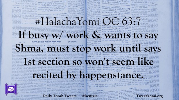 #HalachaYomi OC 63:7 If busy w/ work & wants to say Shma, must stop work until says 1st section so won’t seem like recited by happenstance.
