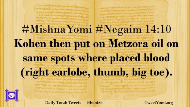 MishnaYomi, Negaim #MishnaYomi #Negaim 14:10 Date: July 16, 2021Author: ysspitz #MishnaYomi #Negaim 14:10 Kohen then put on Metzora oil on same spots where placed blood (right earlobe, thumb, big toe). Share this: Share on X (Opens in new window) X Share on Facebook (Opens in new window) Facebook Like Loading... Related
