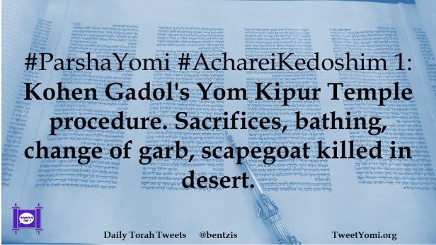 #ParshaYomi #AchareiKedoshim 1: Kohen Gadol’s Yom Kipur Temple procedure. Sacrifices, bathing, change of garb, scapegoat killed in desert.