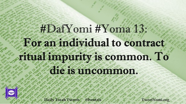 DafYomi, Yoma #DafYomi #Yoma 13 Date: July 19, 2021Author: ysspitz #DafYomi #Yoma 13: For an individual to contract ritual impurity is common. To die is uncommon. Share this: Share on X (Opens in new window) X Share on Facebook (Opens in new window) Facebook Like Loading... Related