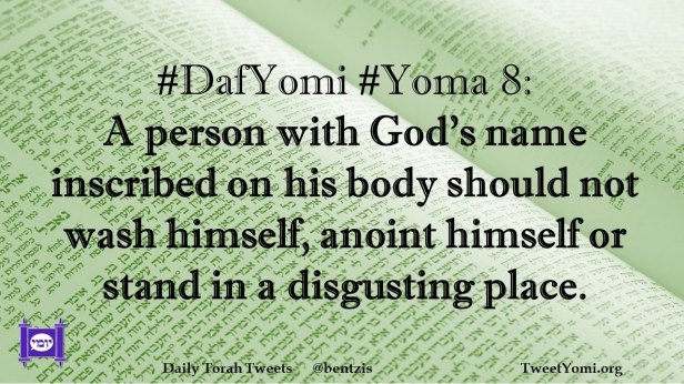 DafYomi, Yoma #DafYomi #Yoma 8 Date: July 19, 2021Author: ysspitz #DafYomi #Yoma 8: A person with God’s name inscribed on his body should not wash himself, anoint himself or stand in a disgusting place. Share this: Share on X (Opens in new window) X Share on Facebook (Opens in new window) Facebook Like Loading... Related