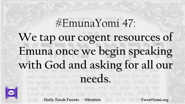 EmunaYomi #EmunaYomi 47 Date: July 19, 2021Author: ysspitz #EmunaYomi 47: We tap our cogent resources of Emuna once we begin speaking with God and asking for all our needs. Share this: Share on X (Opens in new window) X Share on Facebook (Opens in new window) Facebook Like Loading... Related